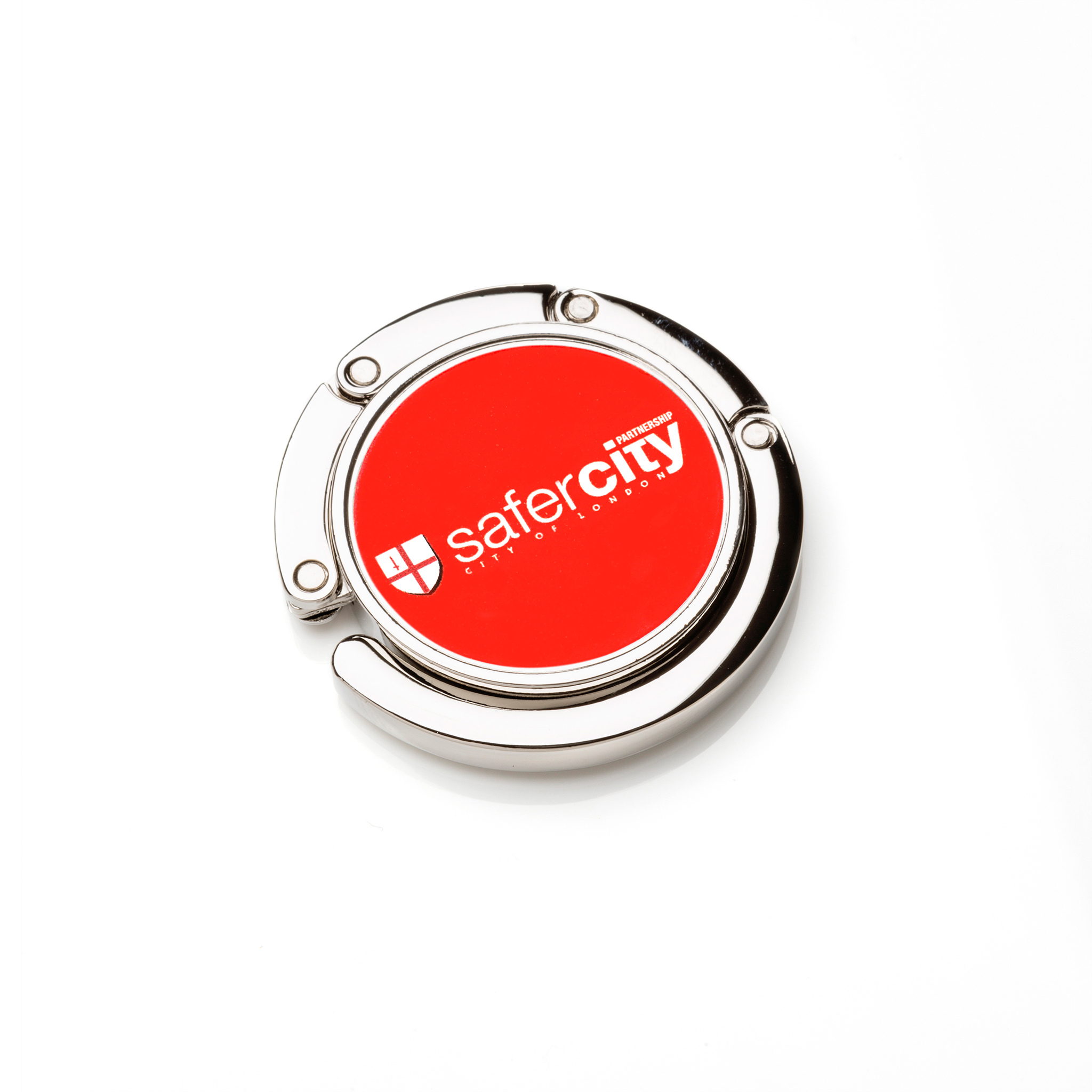 A Bag Hanger is a great way to reduce bag snatching in public places. The Bag Hanger can be used on a table or counter. The Bag Hanger neatly packs away in its own pouch so it can always be kept close at hand. A branded sticker can be applied to the Bag Hanger.