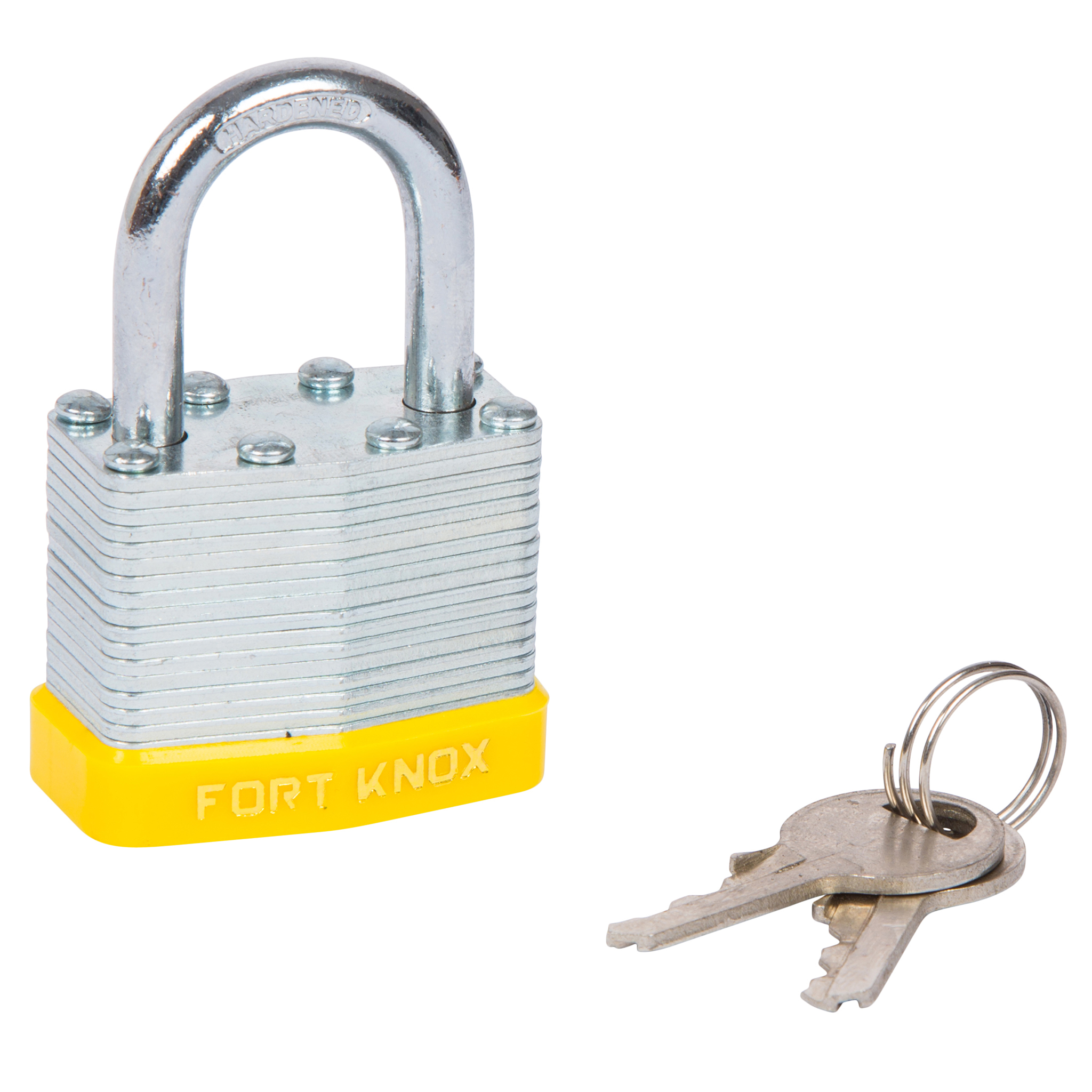 The BlueSpot 40mm Laminated Padlock has a heavy layered steel body with a rubber bumper and brass locking cylinder.