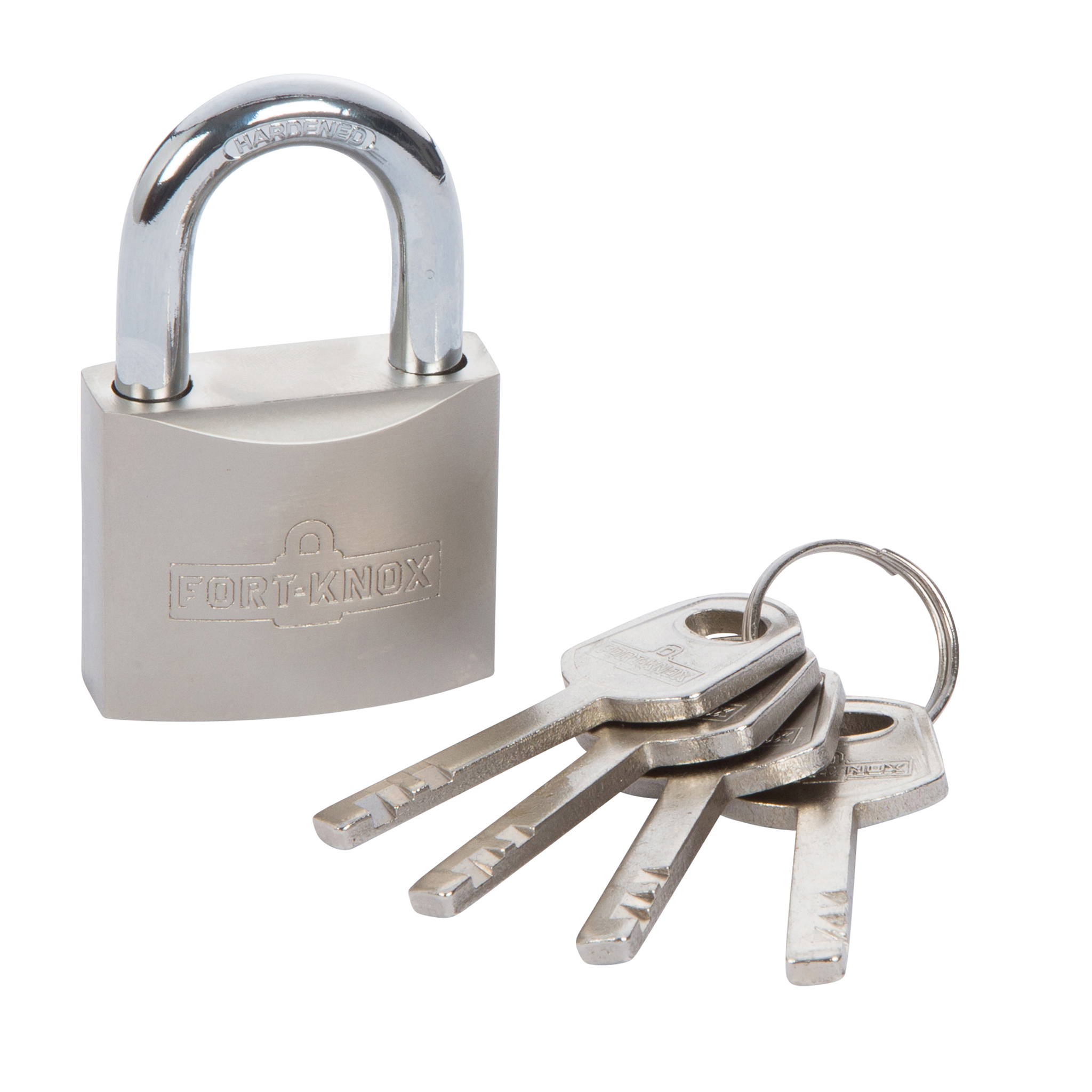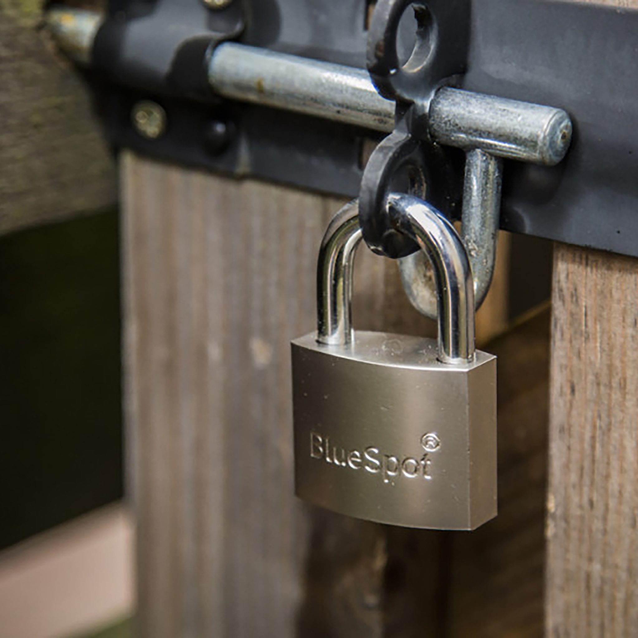 The BlueSpot 40mm satin finish padlock has a nickel-plated solid steel body for increased strength and a brass locking cylinder.