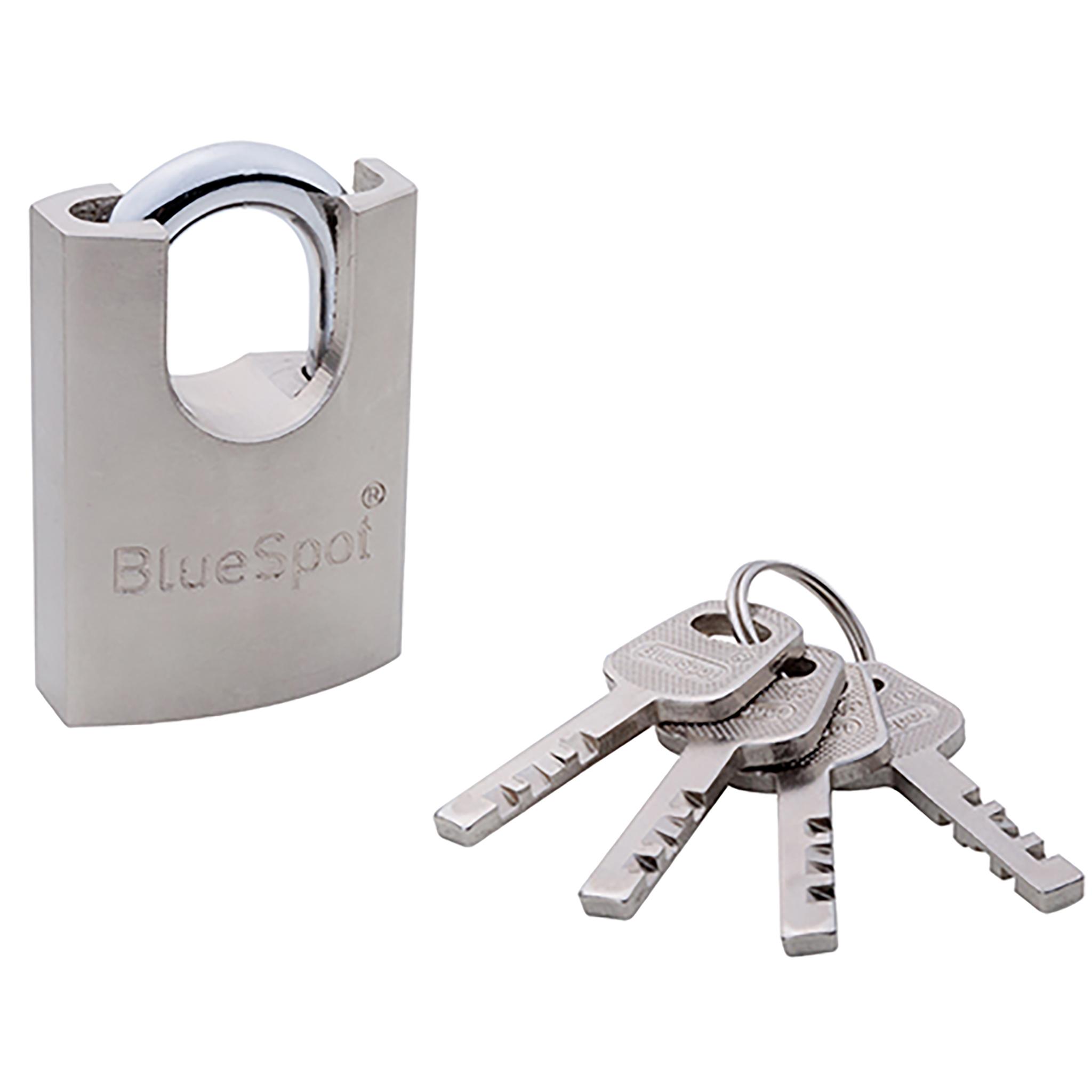 The BlueSpot 50mm Shrouded Satin Finish Padlock has an iron body with a hardened shackle and solid brass cylinder for increased strength and durability.