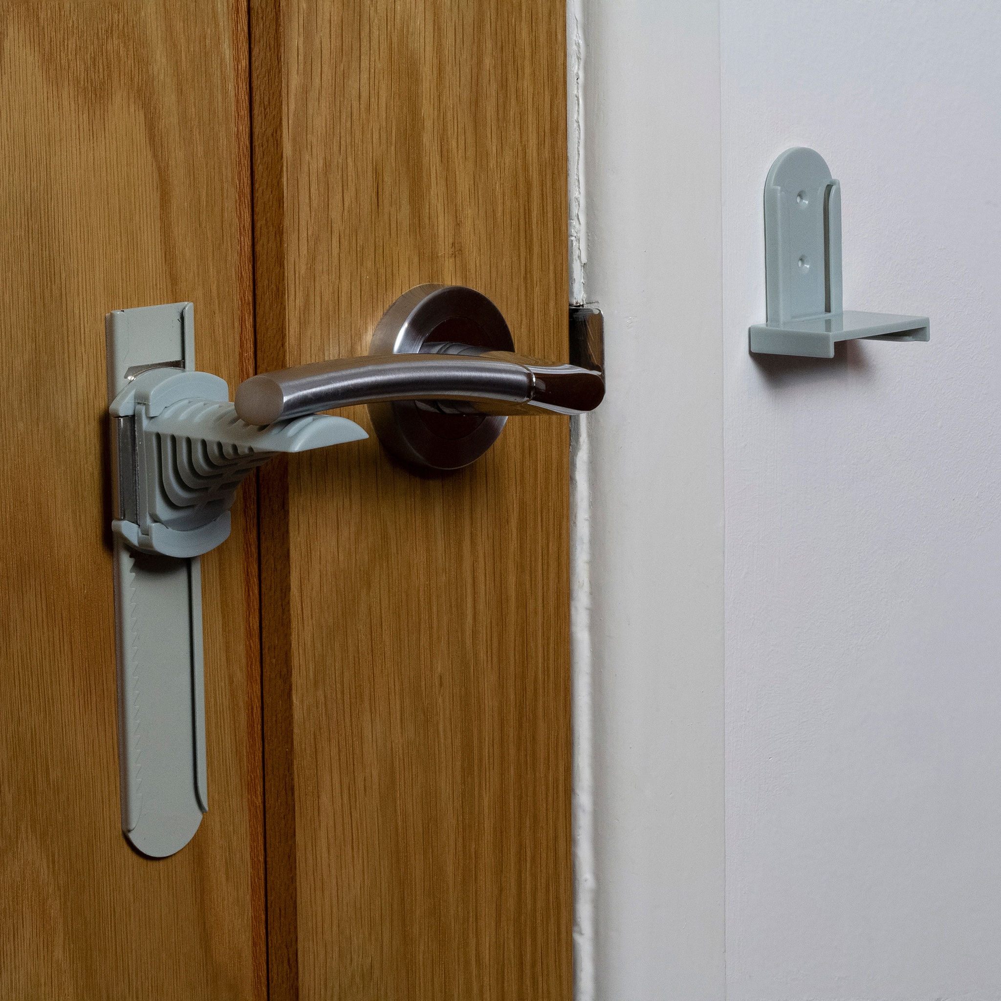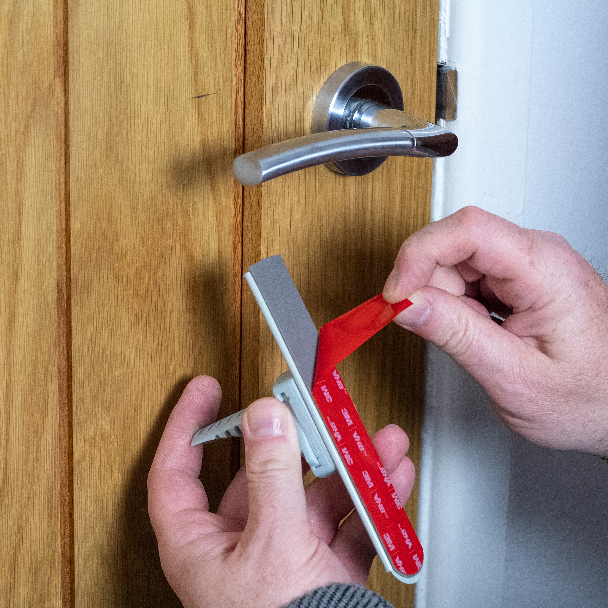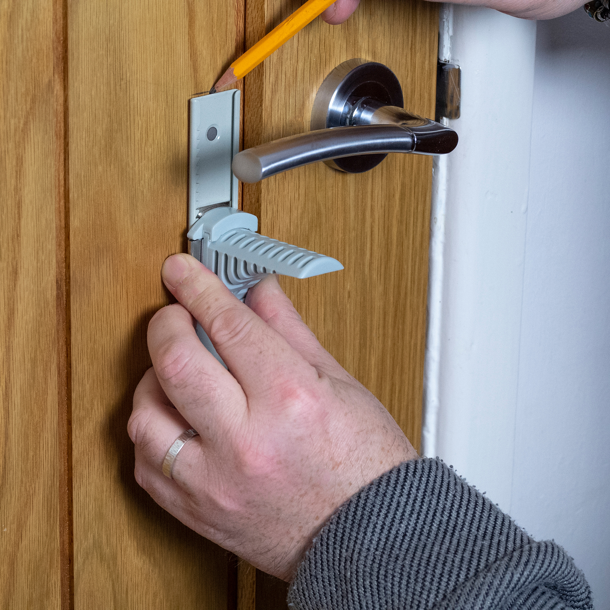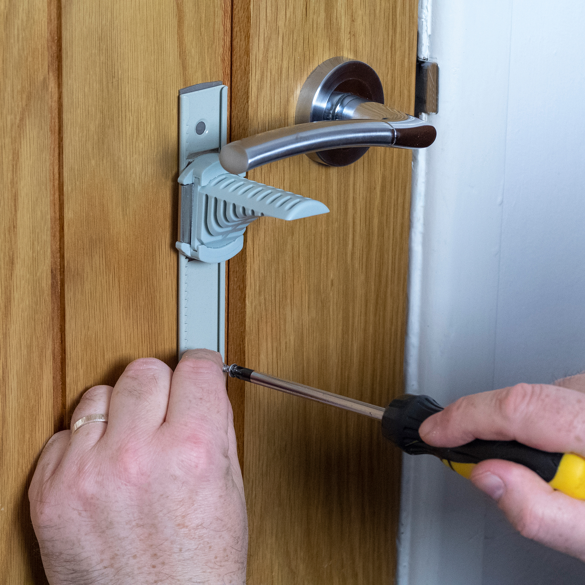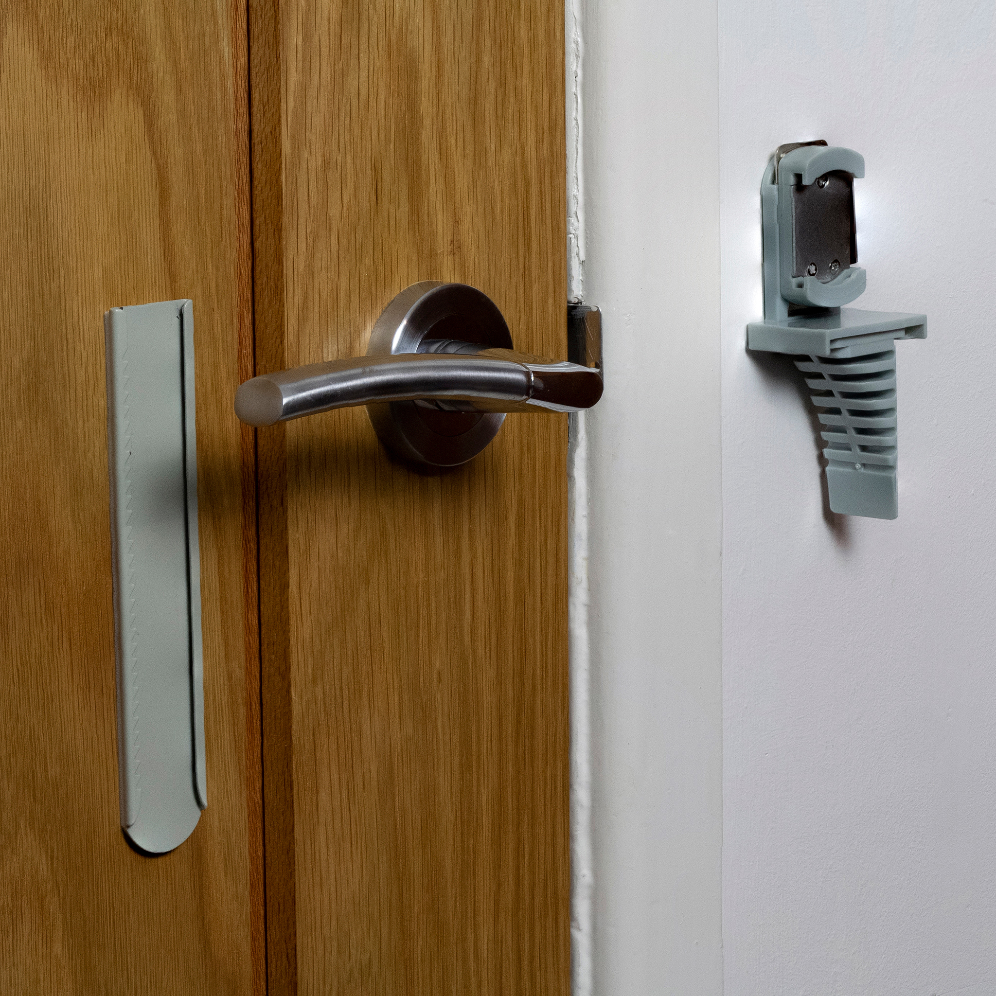 Stick the metal Ratchet under your internal door handle and utilise the intelligently designed jammer to prevent access, all with a simple press and slide action to release the lock.