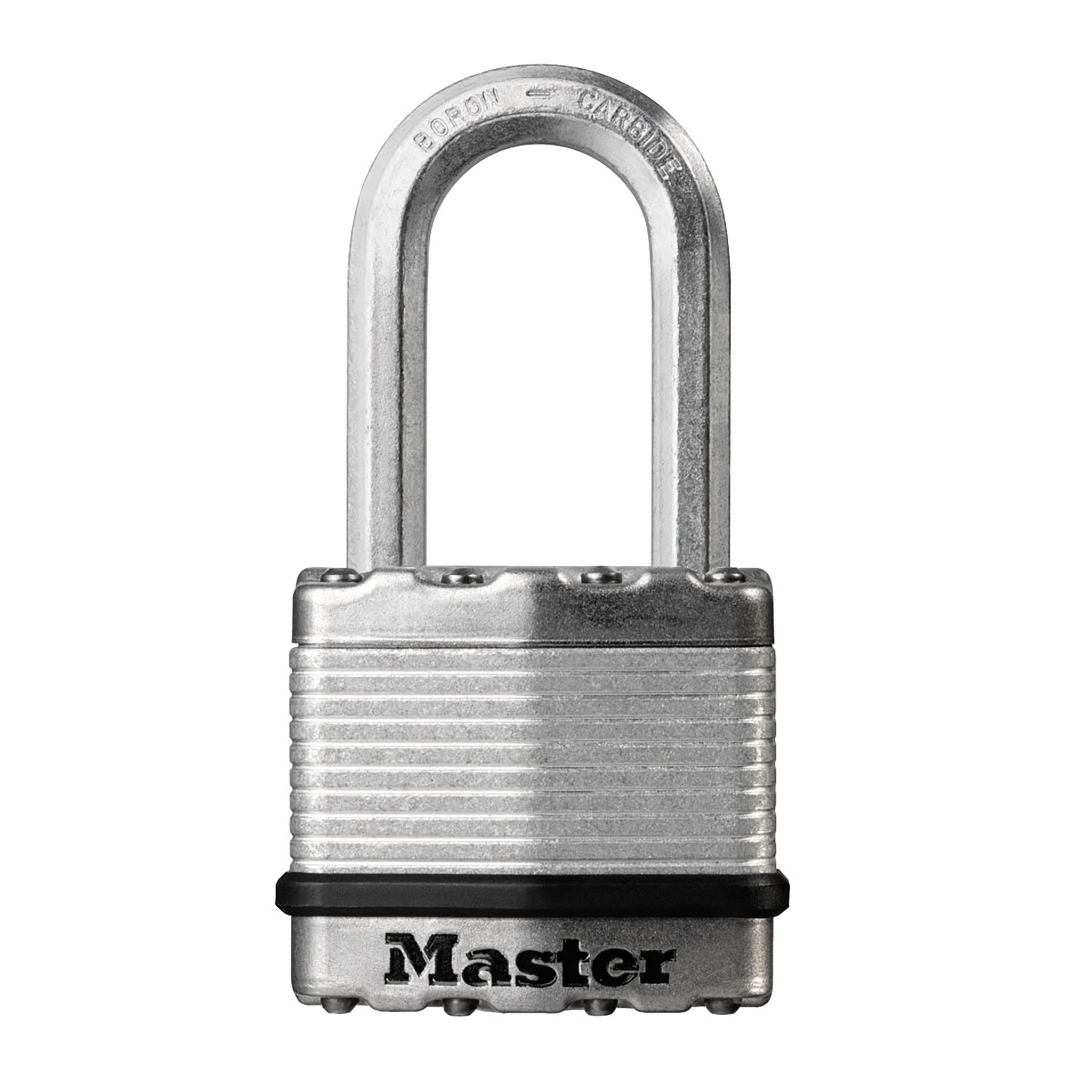 Laminated steel case, stainless steel and zinc cover sleeve for weather resistance. Octagonal Boron Carbide shackle, dual ball bearing locking. Master Lock security level 8.