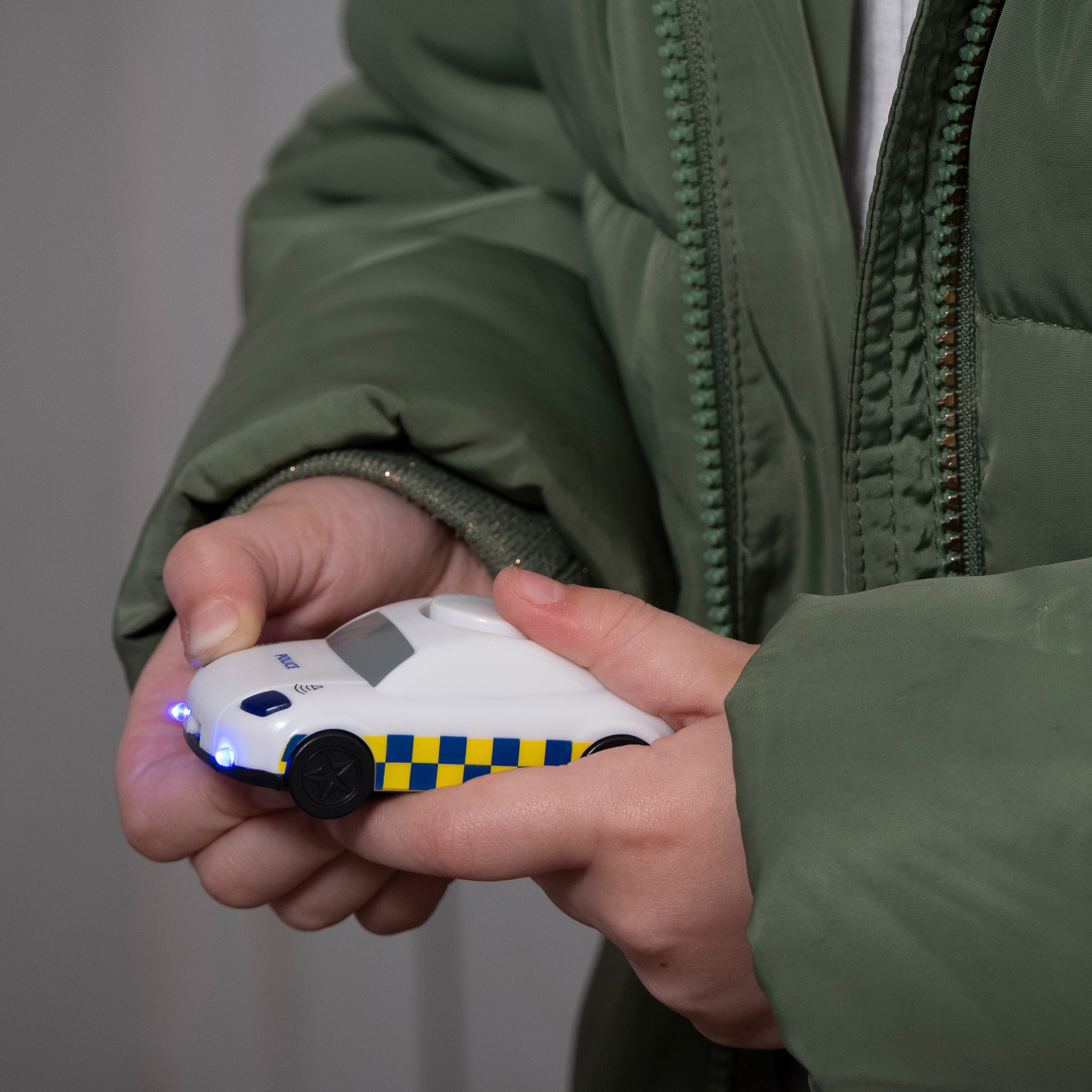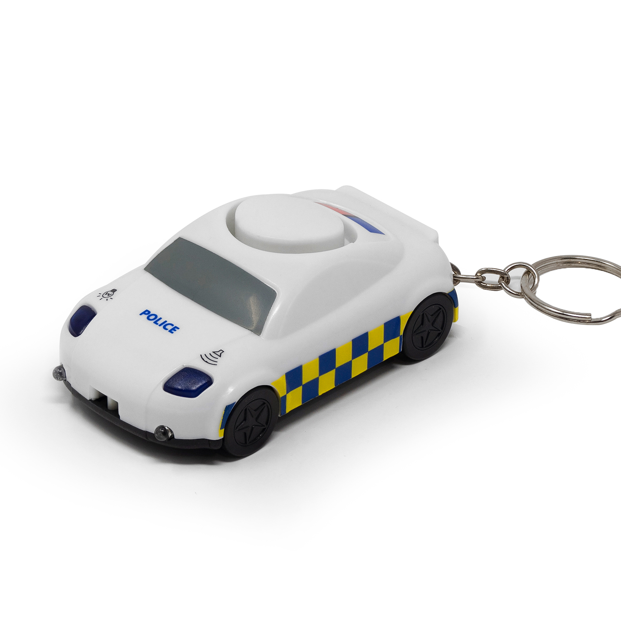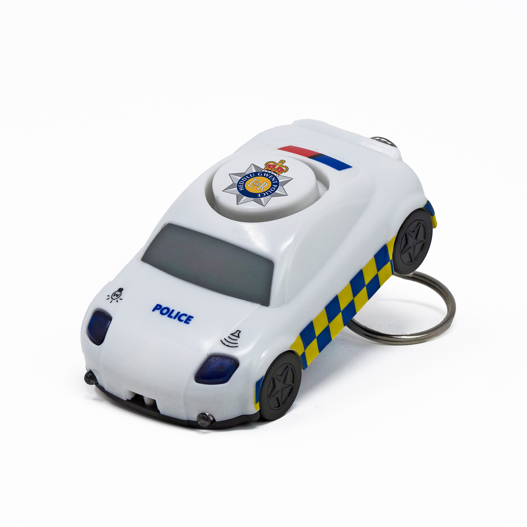 Keyring alarm with 130dBs siren and blue flashing lights. The ultimate engagement item for UK Police Forces, with a perfect branding area for your force crest.