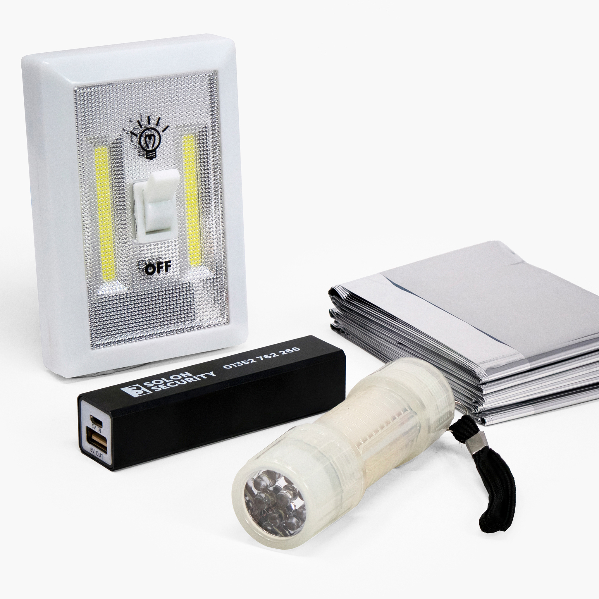 In the event of power cuts or outages, the portable powerbank provides enough charge to keep a phone operational whilst residents make contact for assistance. The low-consumption portable light and torch ensure a residence remains lit and reduces the chance of slips, trips and falls, whilst the space blanket assists with warmth and wellness.