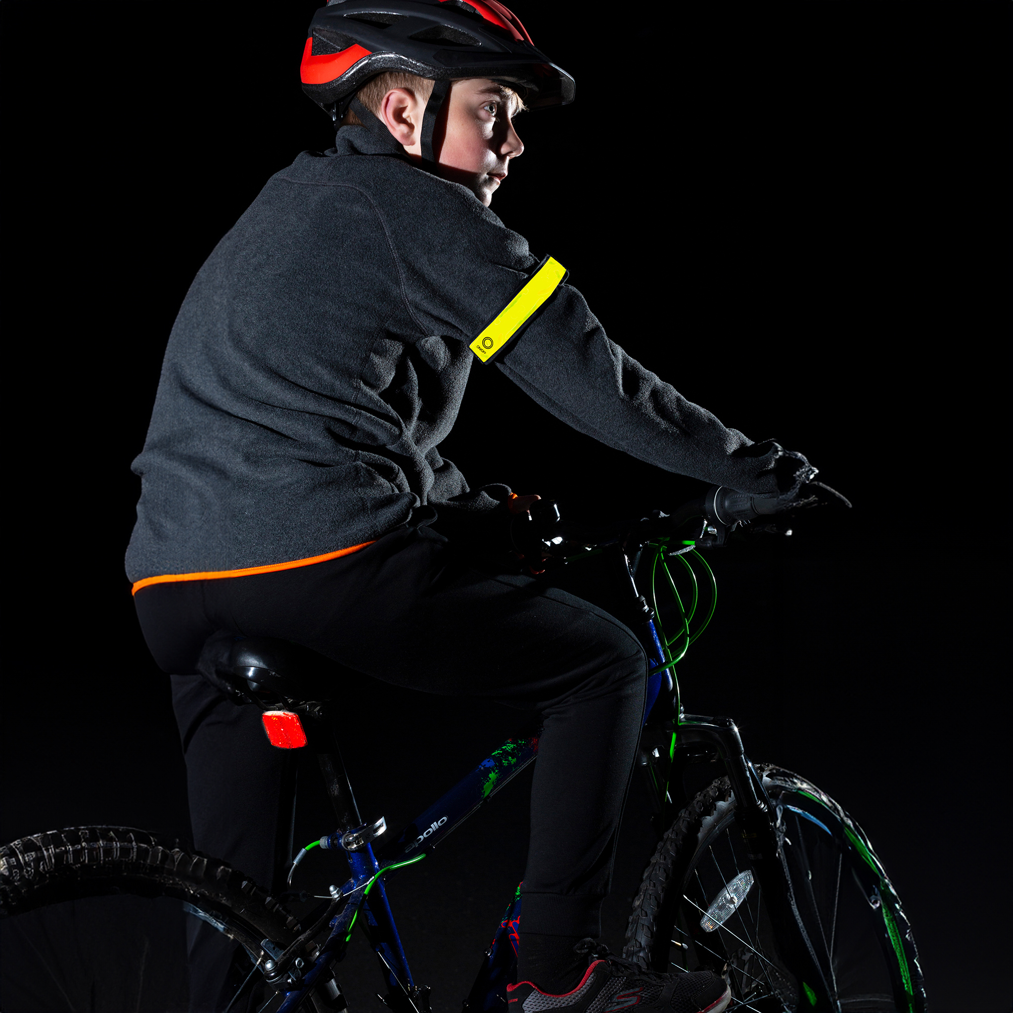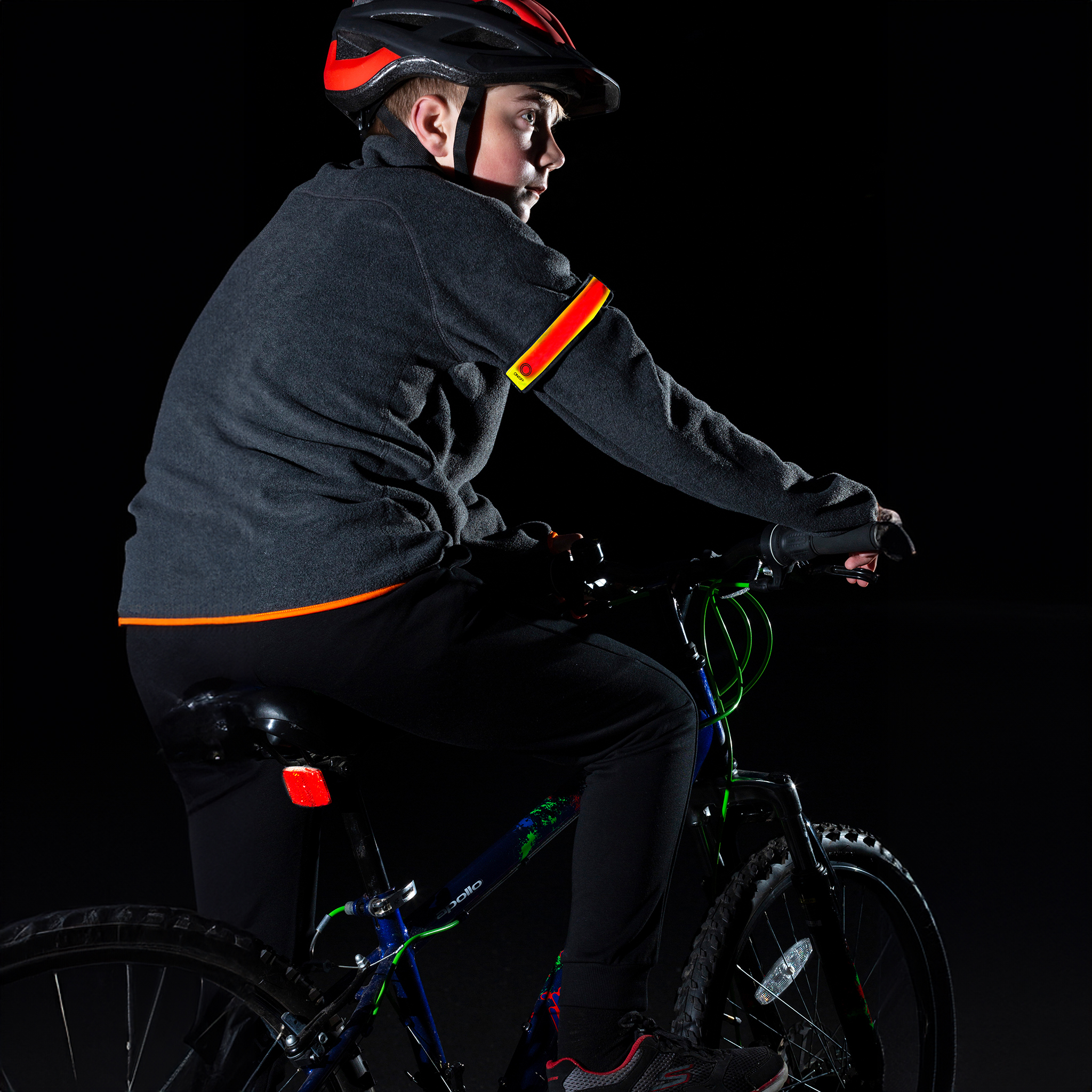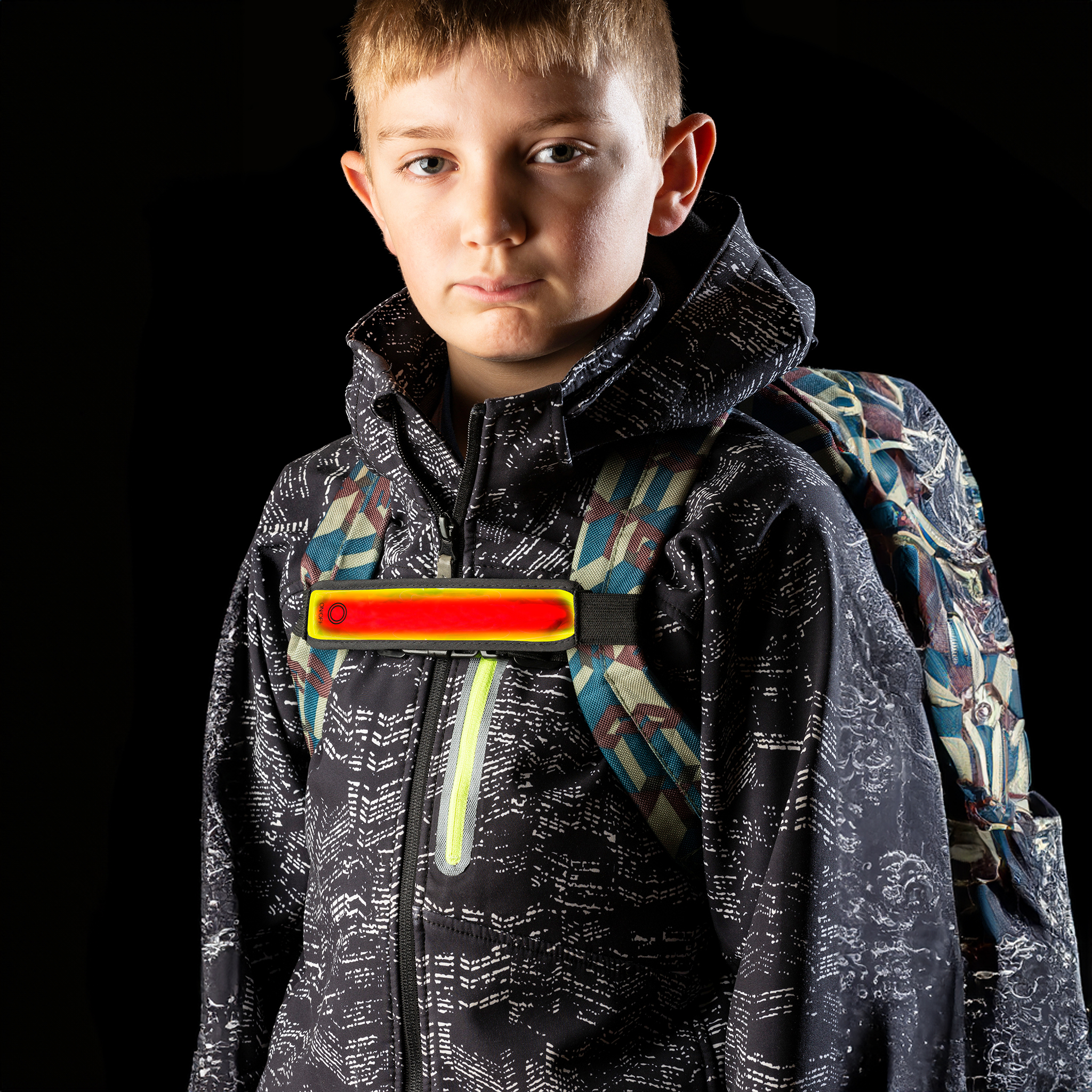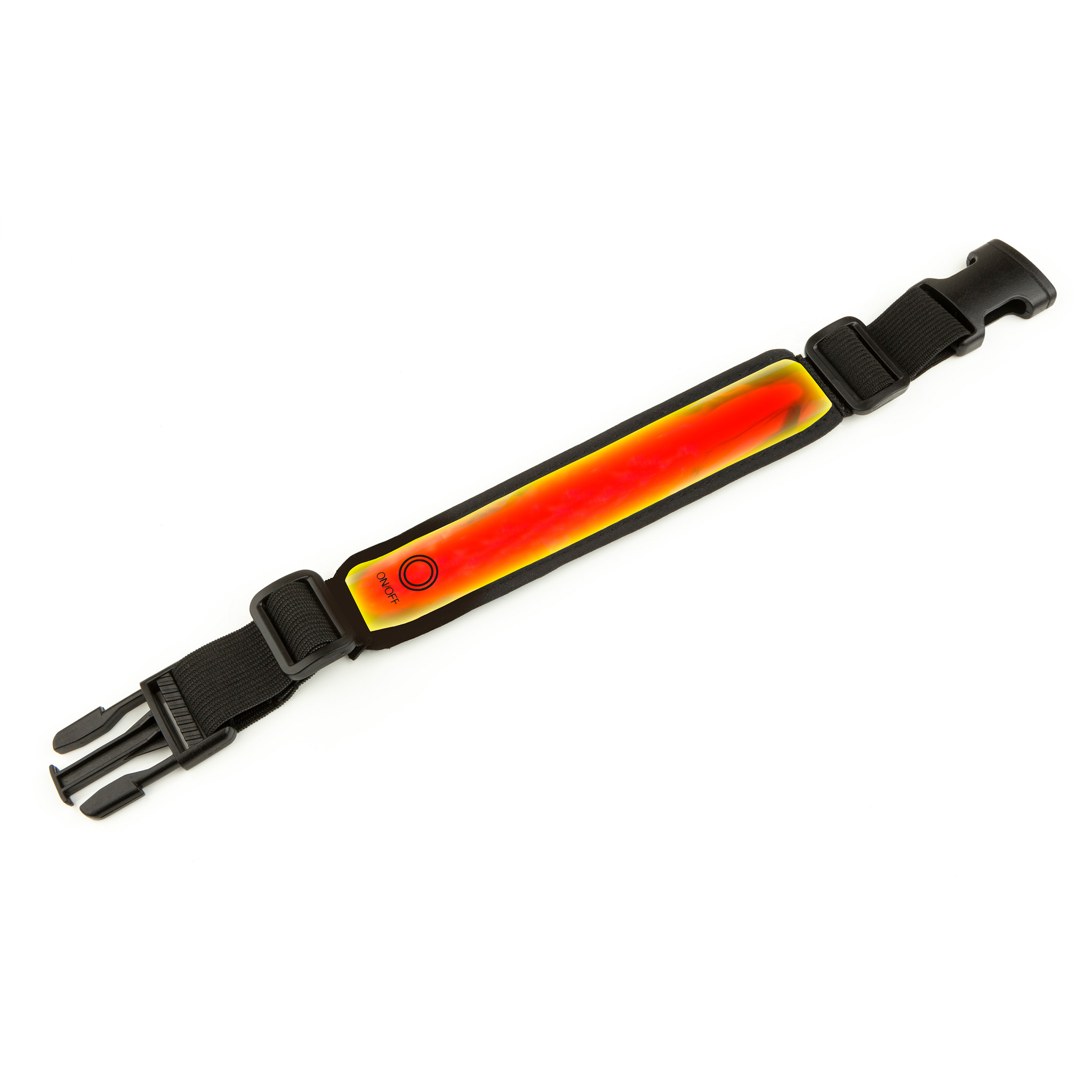 A fully adjustable, multi-use strap containing a bright red LED. Can be affixed to a variety of clothing or bags and held securely in place with the clip.