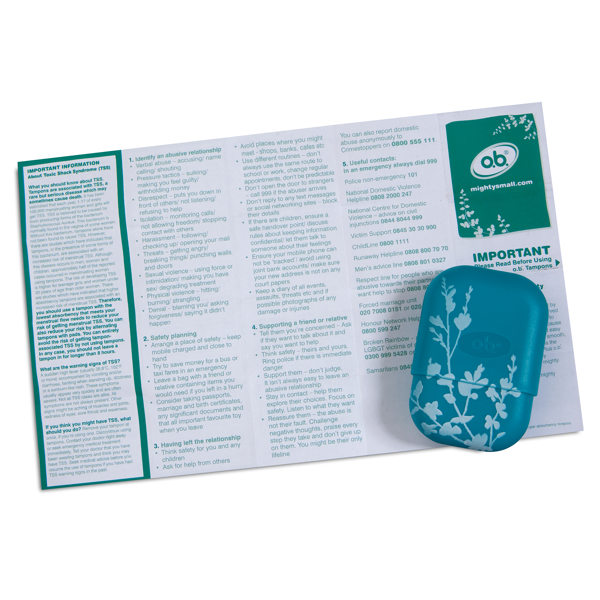 A handy compact tampon kit with covert domestic abuse advice and helplines covertly hidden within the tampon instructions. Kit also contains information about identifying an abusive relationship, safety planning, what to do when you leave the relationship.